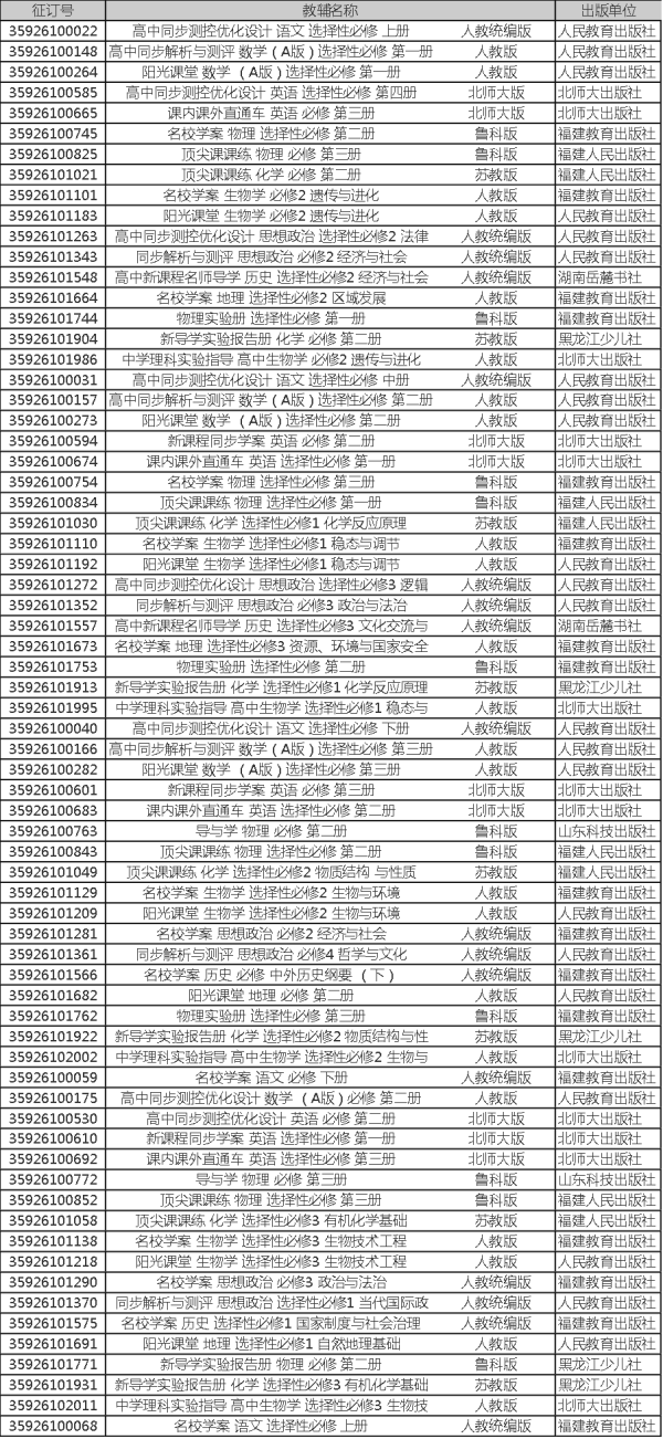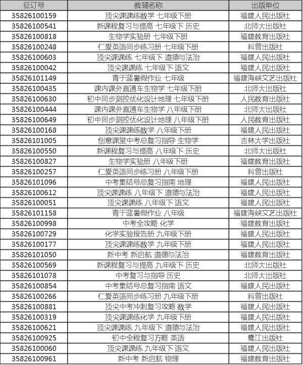 根据《福建省教育厅关于做好2026年春季学期中小学教学用书征订和使用工作的通知》文件精神,中小学教辅实行“一科一辅”制度。为进一步规范我校教辅材料征订工作,我校向社会公布2026年春季教辅材料征订目录,接受家长和群众监督。现将2026年春季我校教辅材料征订目录通告如下(详见附录)。