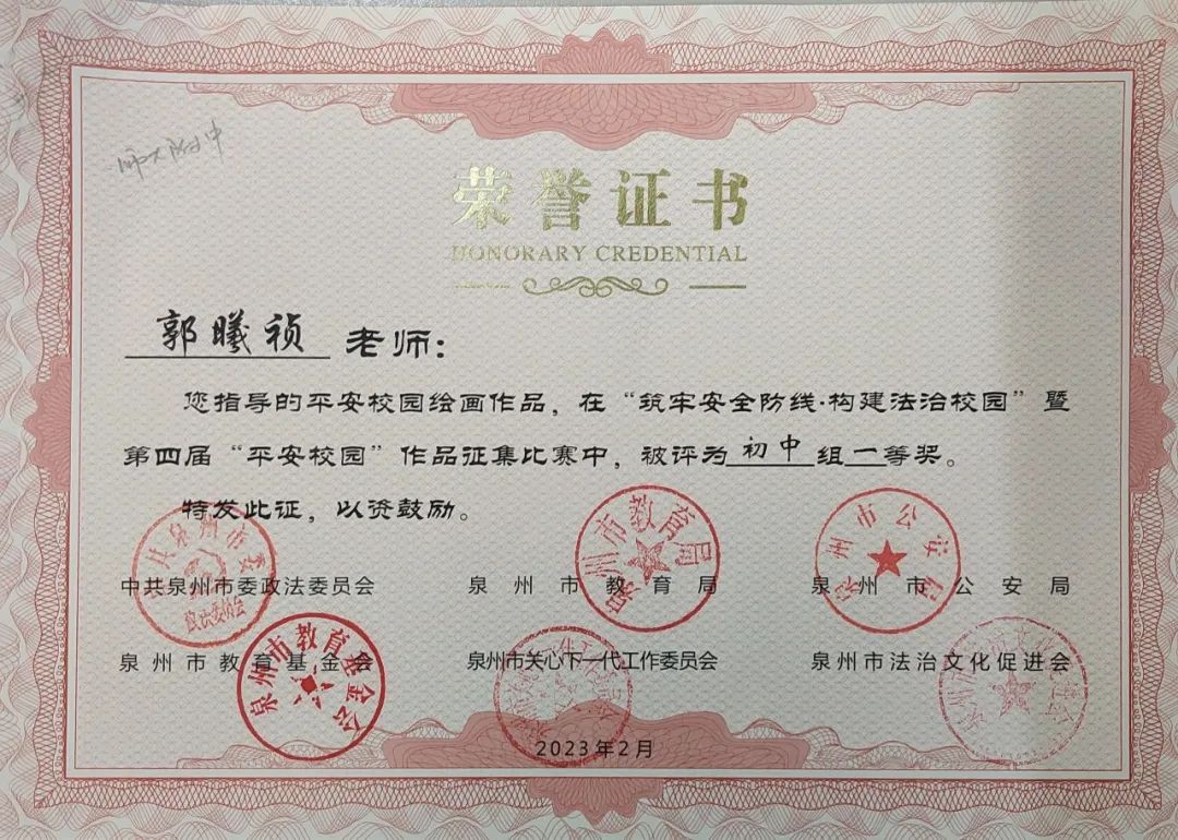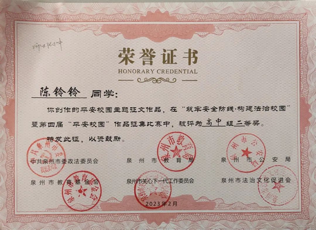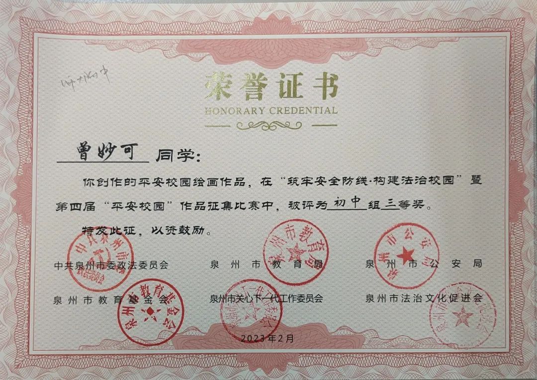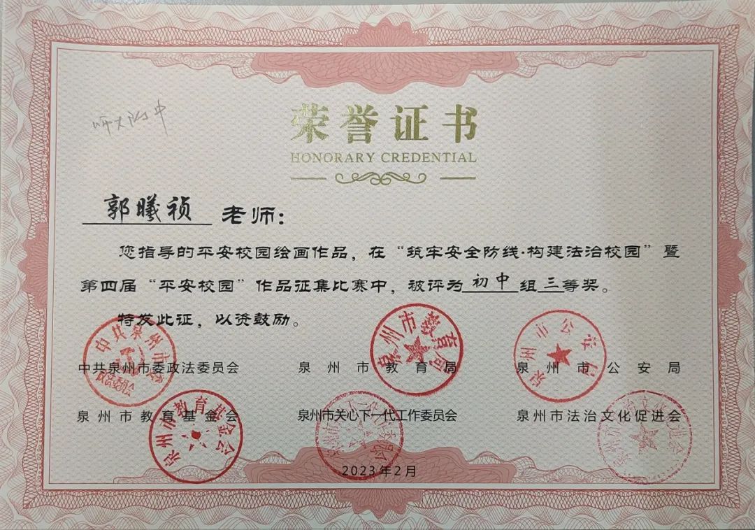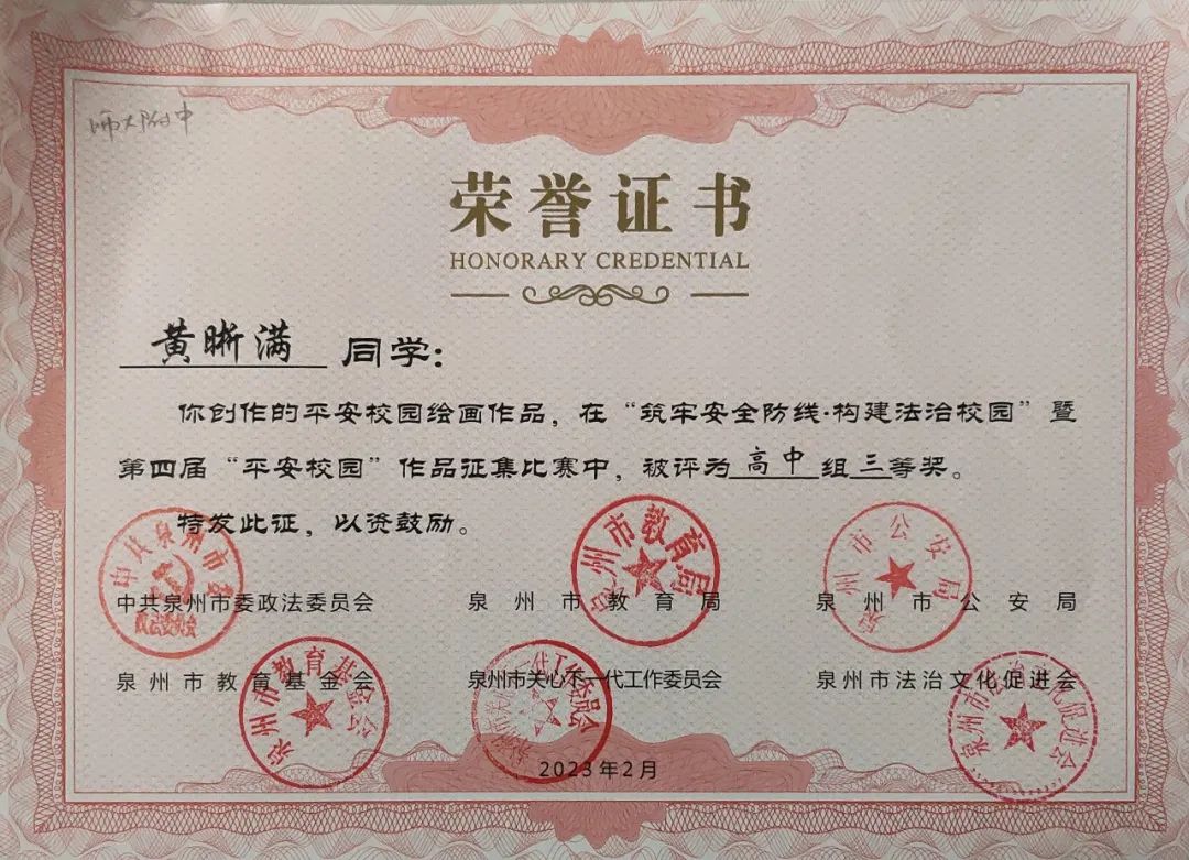 为进一步做好校园安全整治工作,有效预防校园欺凌事件的发生,杜绝校园欺凌行为,提高学生的安全防范意识,守护学生的健康成长,我校师生积极参与泉州市“筑牢安全防线 构建法治校园”暨第四届“平安校园”作品征集比赛,荣获佳绩。
