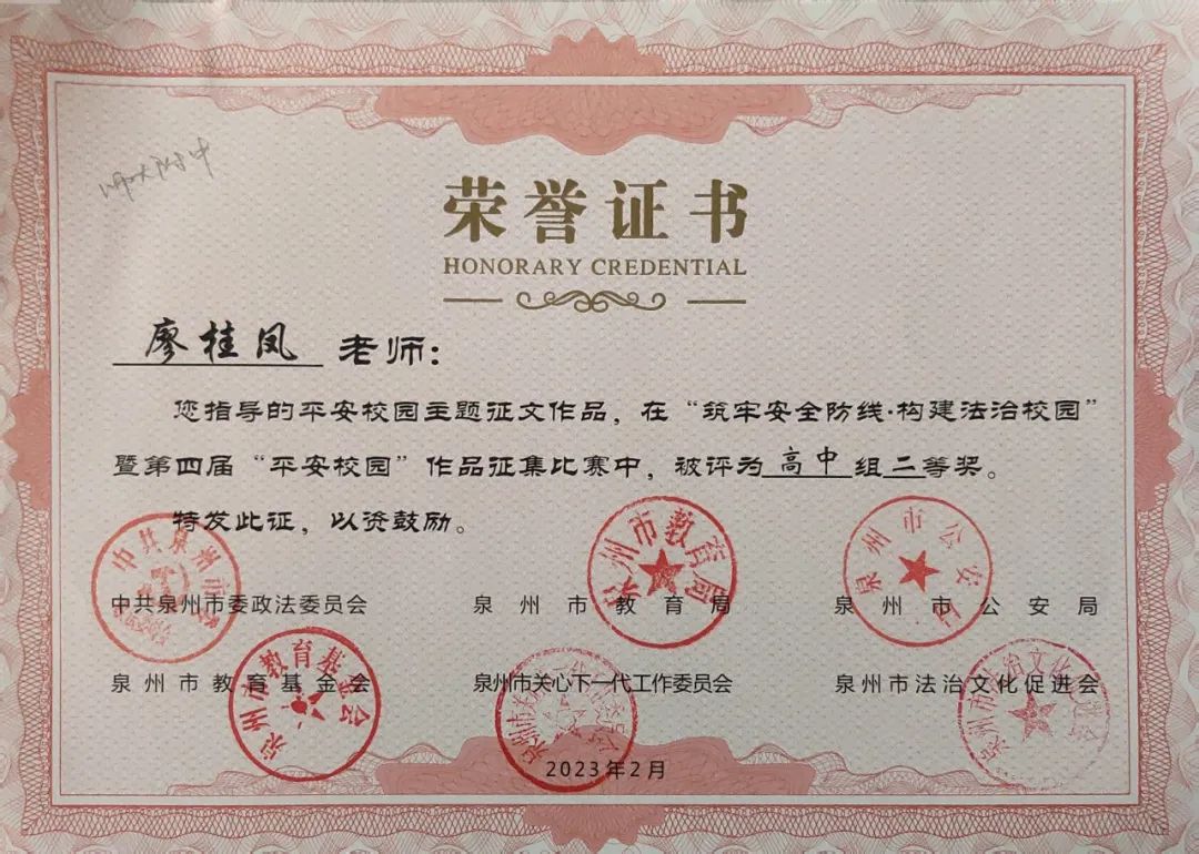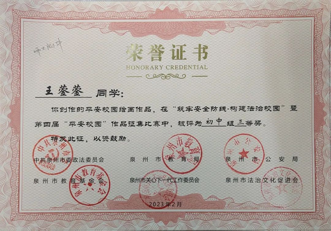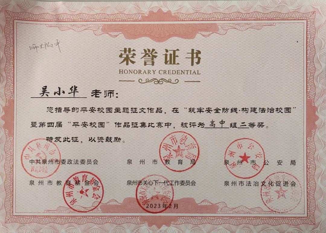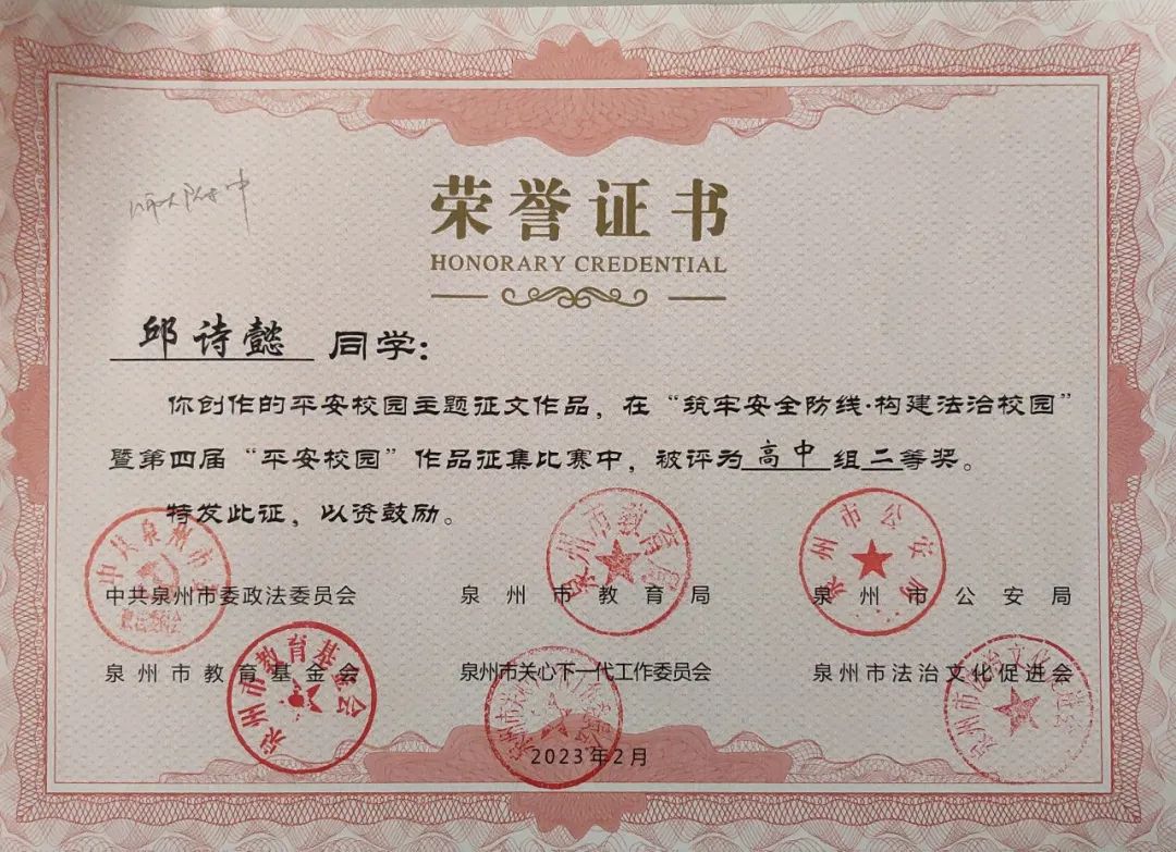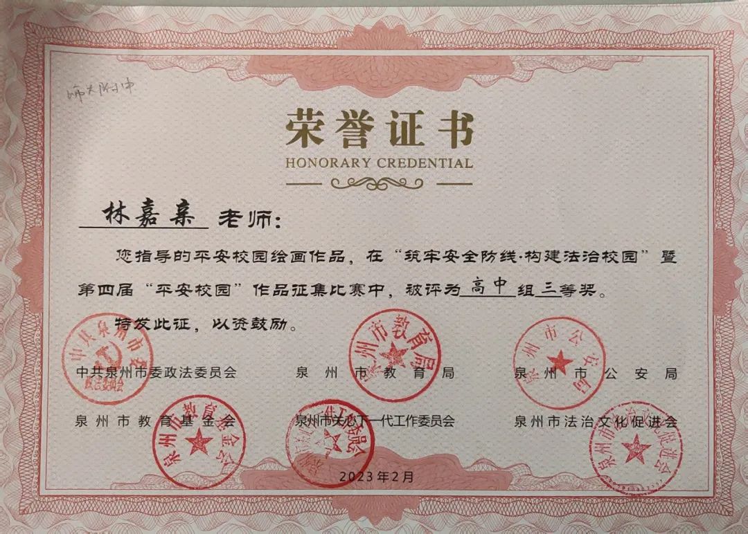 为进一步做好校园安全整治工作,有效预防校园欺凌事件的发生,杜绝校园欺凌行为,提高学生的安全防范意识,守护学生的健康成长,我校师生积极参与泉州市“筑牢安全防线 构建法治校园”暨第四届“平安校园”作品征集比赛,荣获佳绩。