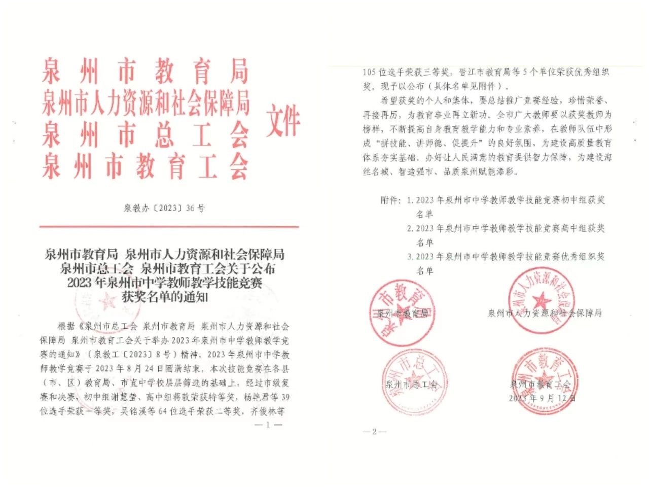 近日,由泉州市教育局、泉州市人力资源和社会保障局、泉州市总工会、泉州市教育工会联合举办了2023年泉州市中学教师教学技能竞赛活动已圆满结束。